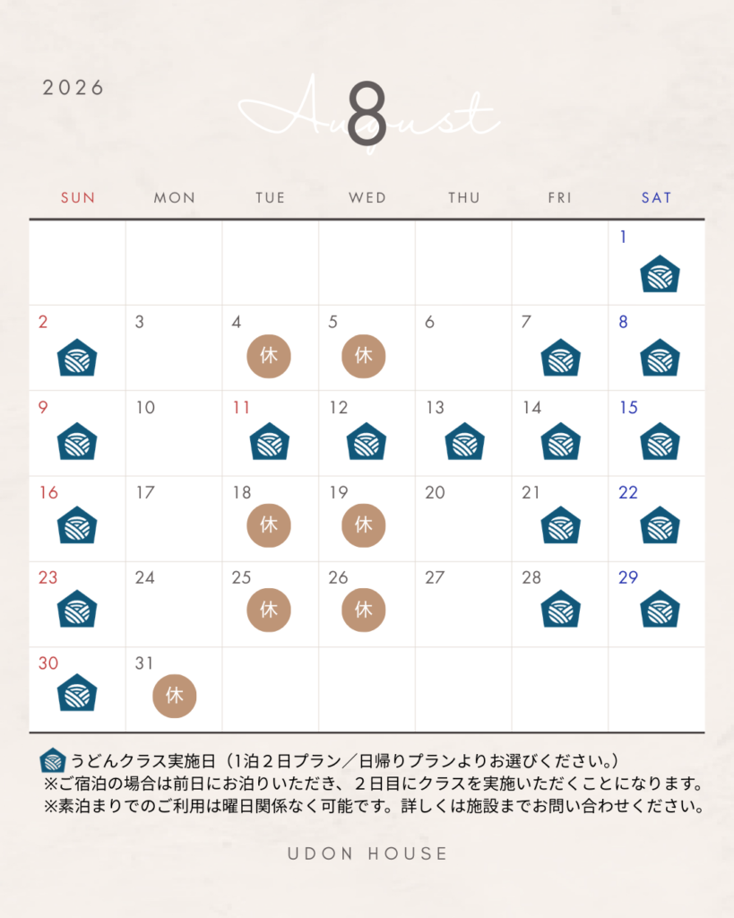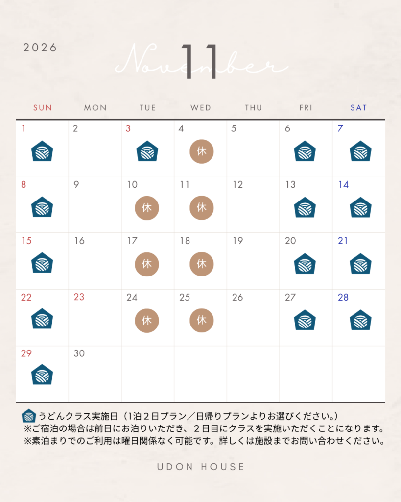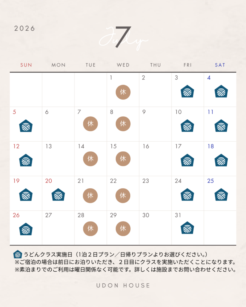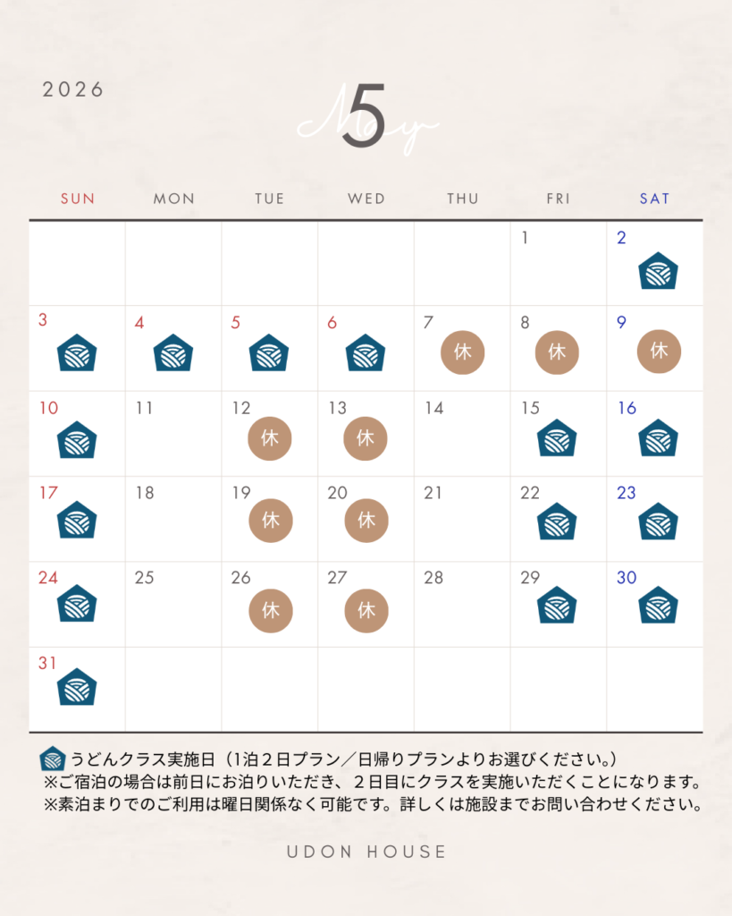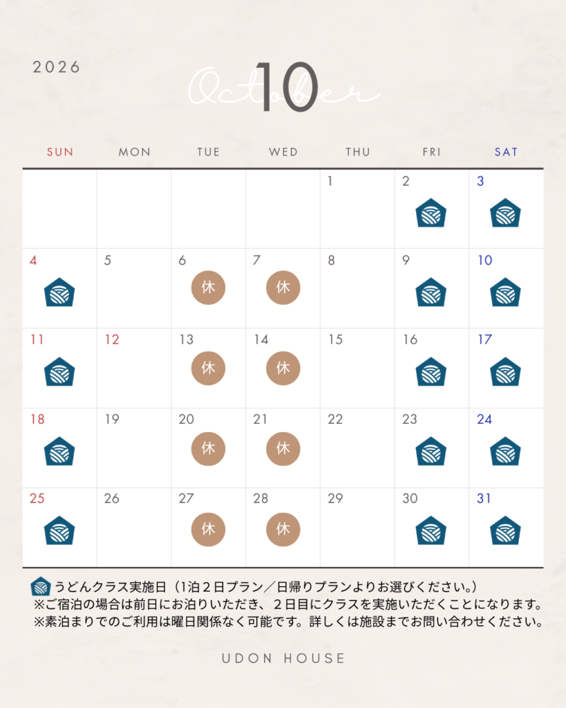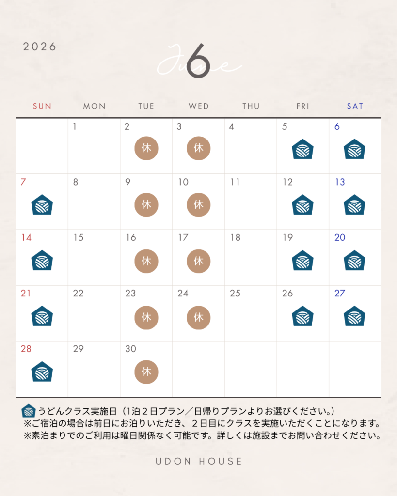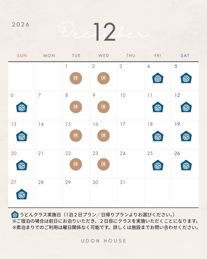 UDON HOUSEは2026年4月より営業日を原則金土日の週末及び祝日とし、平日については素泊まりのご予約のみお受けすることに致しました。